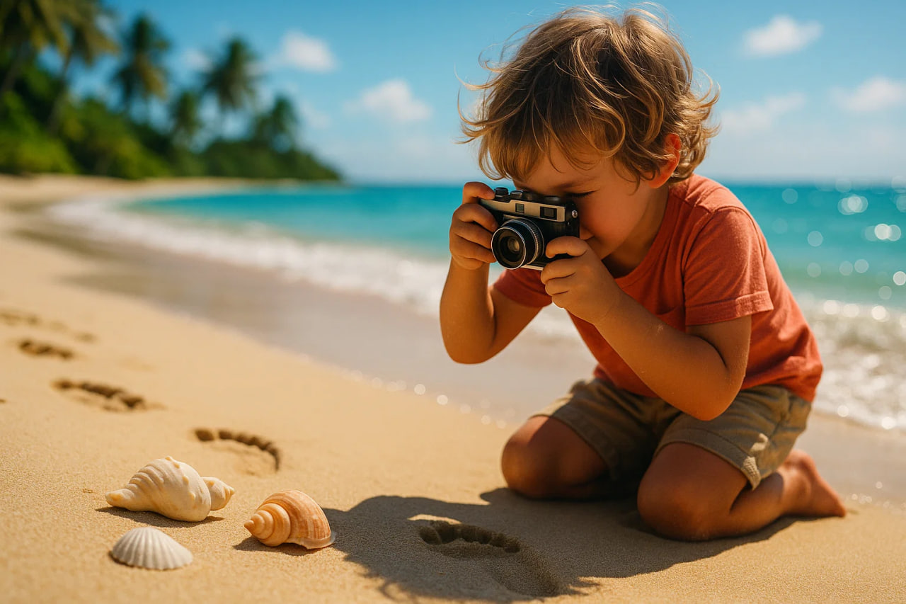 Необычная идея: дайте ребёнку телефон или фотоаппарат и задание, сфотографировать всё круглое или синее на пляже. Это развивает наблюдательность, чувство кадра и превращает прогулку в игру. А вечером можно устроить семейную выставку, лучшие снимки выбирает жюри из родителей.