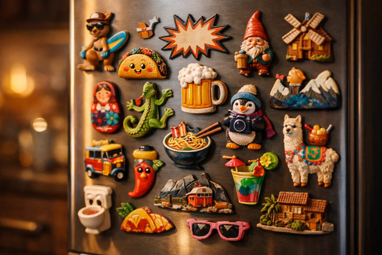 Да, магниты — это классика. Но можно усложнить задачу: привозить не просто «вид на город», а магниты с локальным юмором, сленгом, необычной графикой.