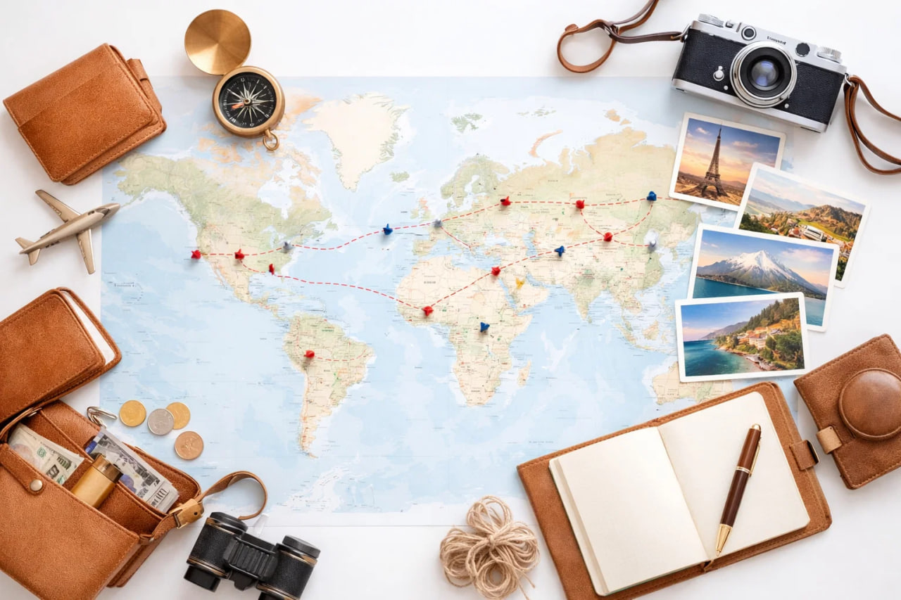 Карта мира или страны, где можно отмечать посещённые места, превращает путешествия в визуальную историю.