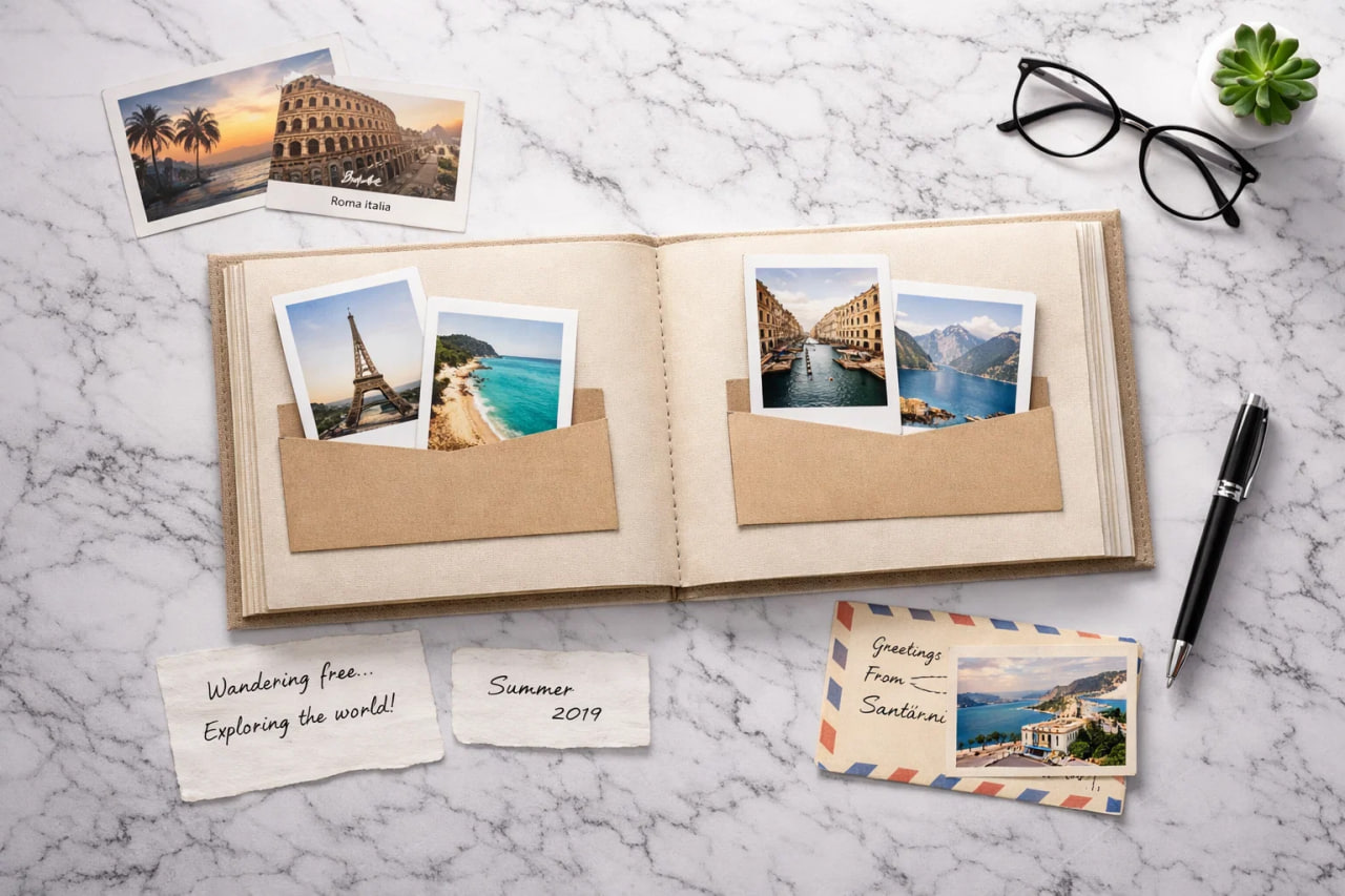 Красивый альбом для путешествий — это не просто место для фотографий, а способ сохранить эмоции, билеты, открытки, заметки и маленькие детали поездок.