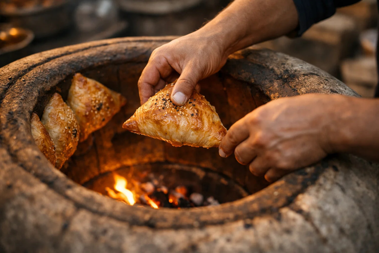 Её готовят в тандыре — глиняной печи, где температура даёт ту самую корочку.