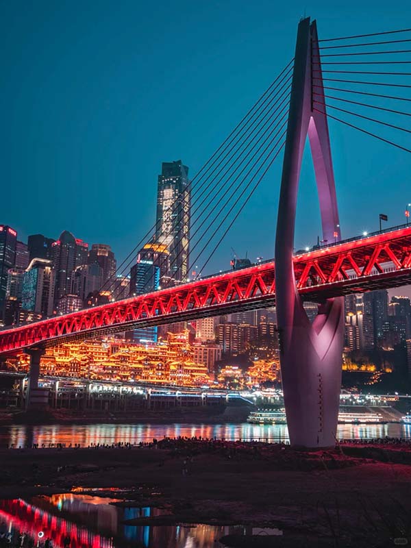 - После ужина знакомство с ночным Чэнду: прогулка по барной улице Цзюяньцяо, ночной вид моста Ланцзяо.